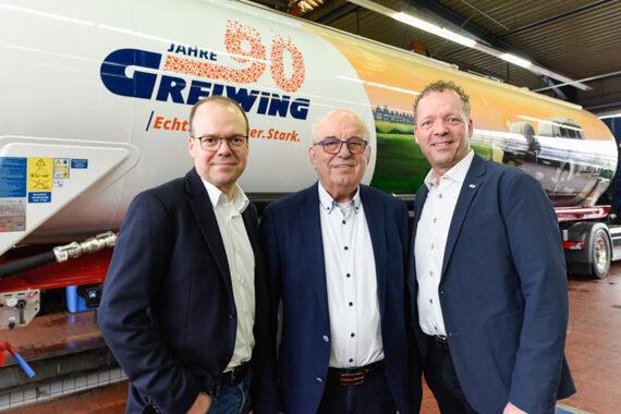 Wir werden in diesem Jahr 90. Anlässlich unseres Jubiläums haben wir heute an unserem Stammsitz in Greven einen speziellen Silo-Auflieger enthüllt, auf dem unter anderem das Bild des ersten Lkw prangt, der unter unserer Flagge fuhr. Gegründet wurde unser Unternehmen, das nach wie vor in Familienhand ist, von Alfons Greiwing im Jahr 1930. Heute leiten Jürgen und Roland Greiwing sowie die beiden Geschäftsführer Matthias Geiß und Matthias Gehrigk die Geschicke unseres Betriebes, der aktuell mit mehr als 800 Mitarbeitern jährlich über 100 Millionen Euro umsetzt.