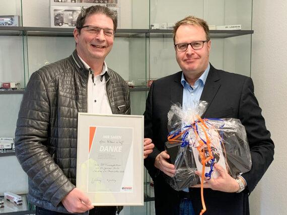Ludger Wieskamp ist Logistiker durch und durch. Bereits seit 30 Jahren trägt der heute 56-Jährige entscheidend dazu bei, dass bei uns die Räder nicht still stehen. Mit viel Fleiß, Einsatzfreude und Durchsetzungsvermögen hat sich der gelernte Speditionskaufmann aus Altenberge bei uns in den vergangenen drei Jahrzehnten vom Mitarbeiter in der Abrechnung über die Disposition und einen Teamleiter-Posten bis zum Speditionsleiter hochgearbeitet. Zum runden Betriebsjubiläum haben wir nun mit Präsent und Urkunde geehrt.