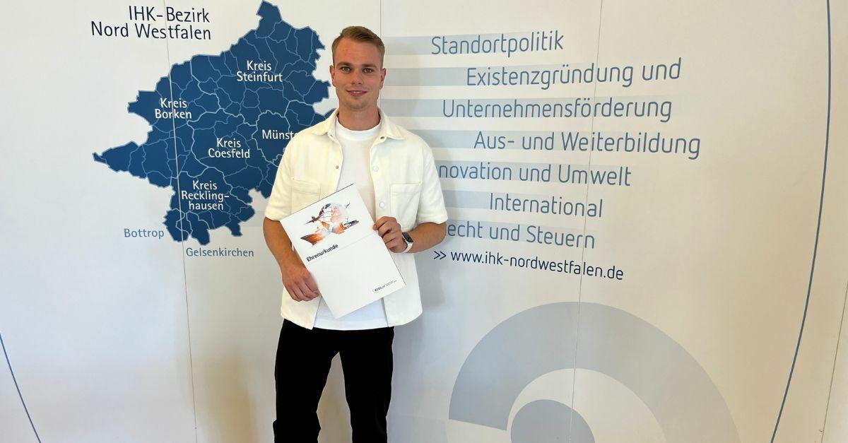 Er gehört zu den besten Auszubildenden im IHK-Bezirk Nord Westfalen: Unser frisch ausgebildeter Kaufmann für Speditions- und Logistikdienstleistungen, Johannes Wegmann, wurde am 18. September von der IHK Nord Westfalen geehrt. Mit der Note „gut“ in seiner Abschlussprüfung zählt er zu den besten Auszubildenden der Region.